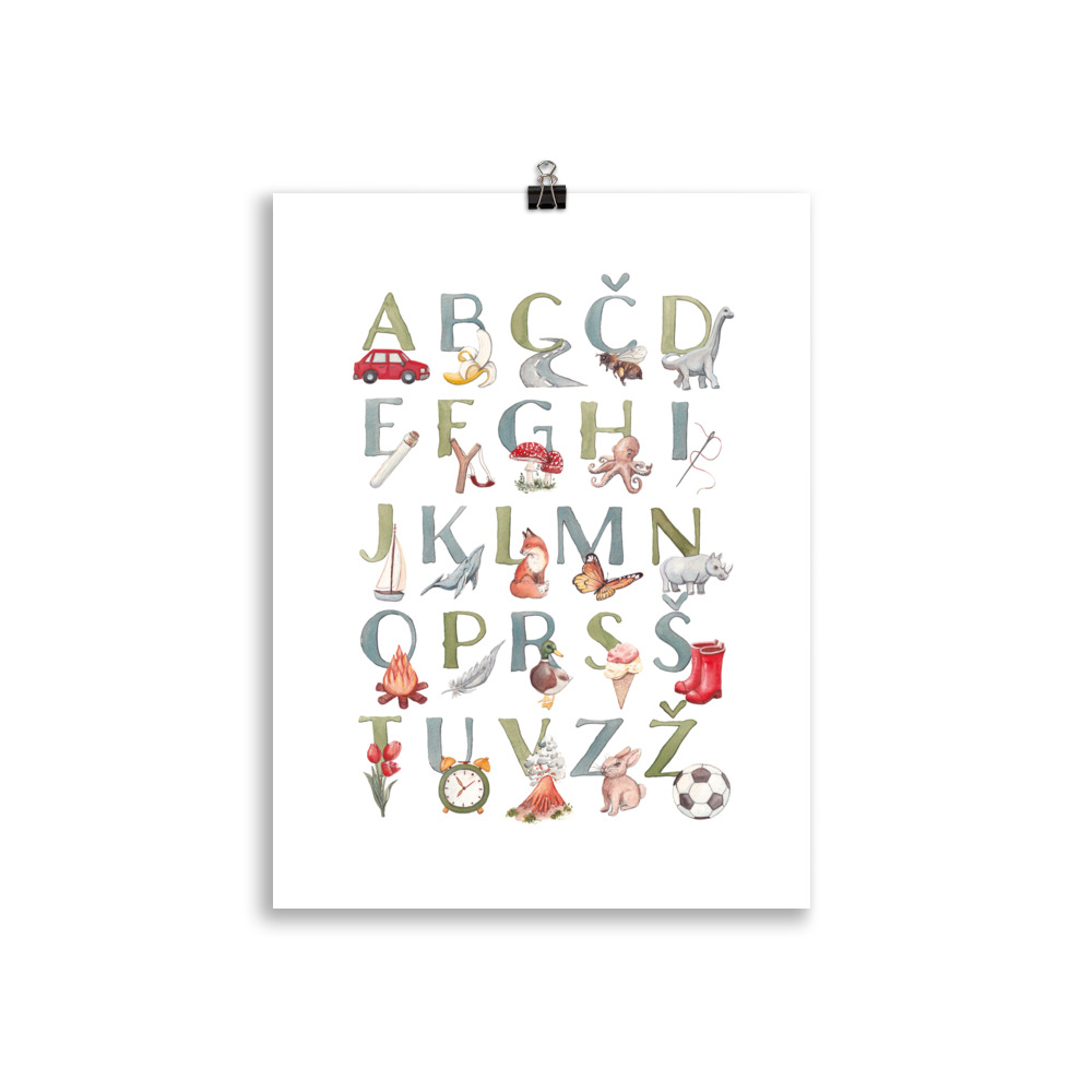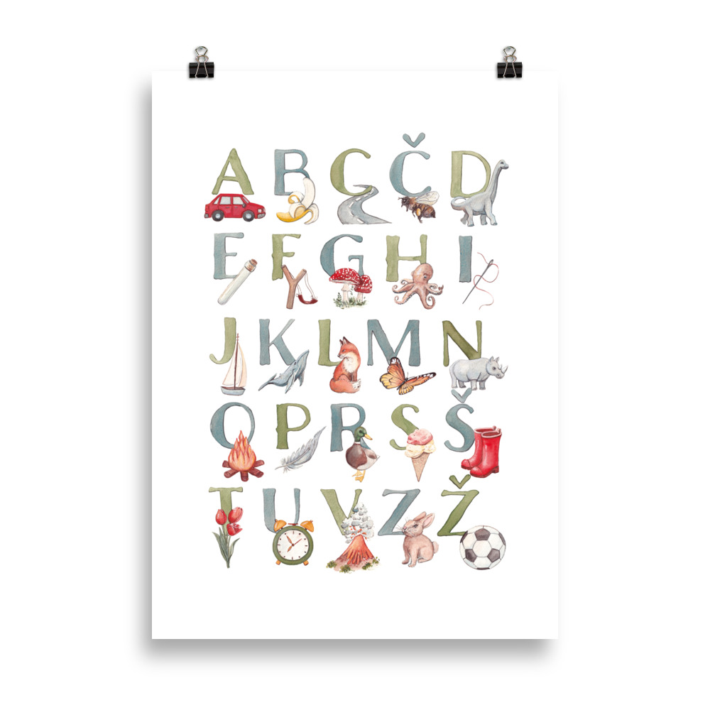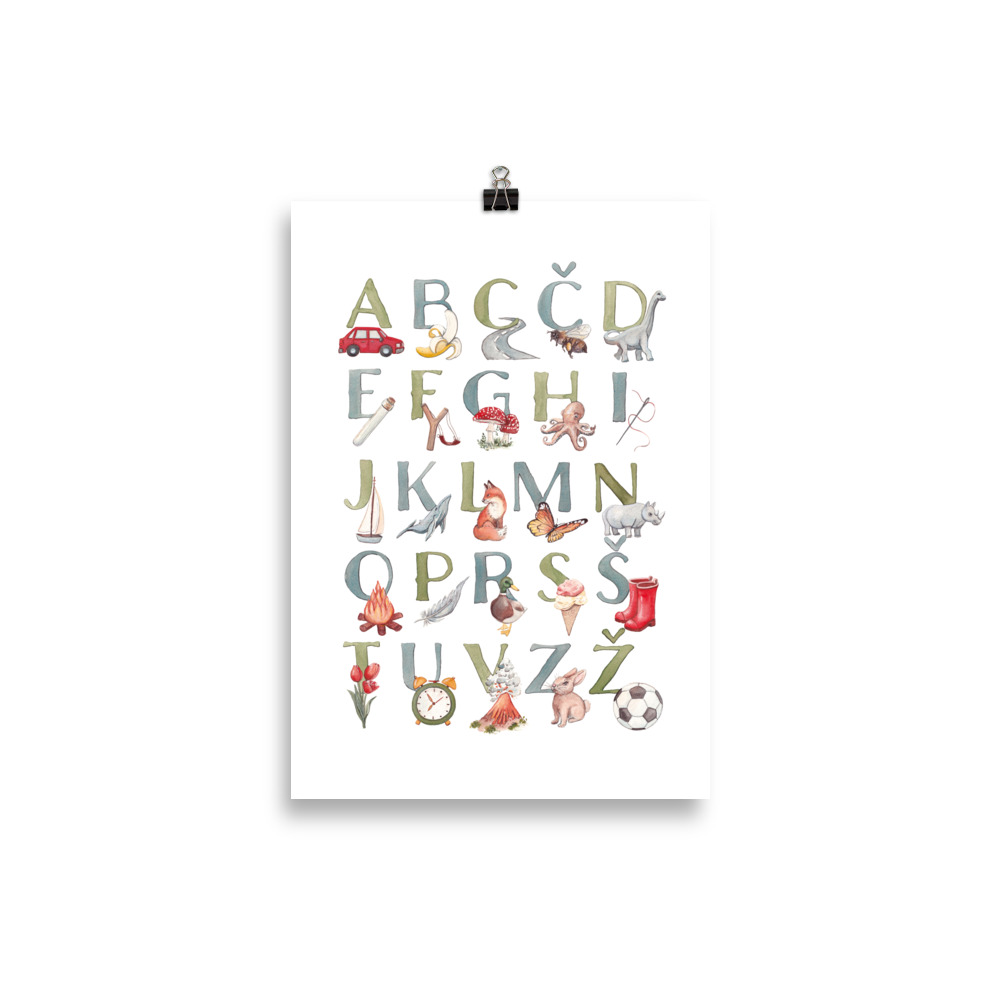 Ilustriran plakat slovenske abecede pomaga otrokom pri učenju črk in prvih korakih v svet branja. Prikupna podoba in naravne barve ustvarjajo prijetno okolje za učenje in igro.